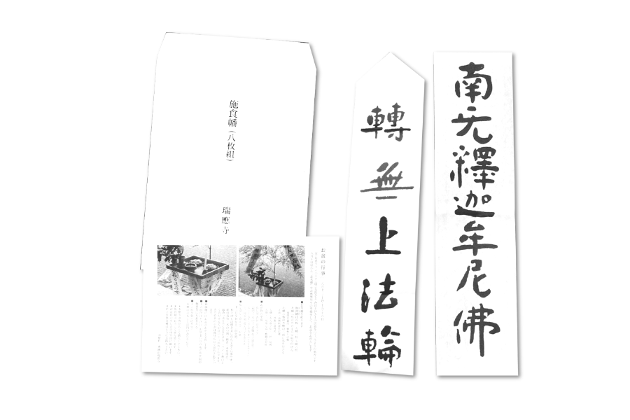 施食幡はお盆にご先祖様、みほとけさまの供養を行う際に使用するもので、「施食幡」を施食棚の上に掛け、施食旗を立てて法要を営みます。